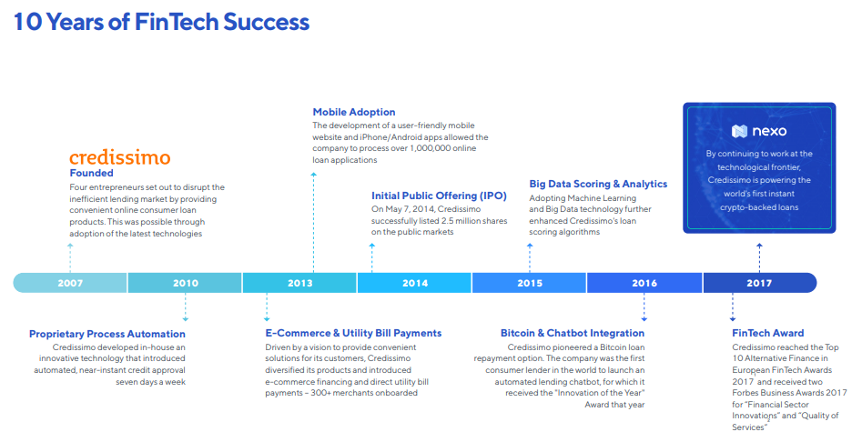 Nexo یک سیستم وام دهی بر بستر بلاک چین است که به کاربران اجازه می دهد با ارز دیجیتال وام بگیرند. سازنده این پلتفرم وام دهی شرکت Credissimo است که یک شرکت فناوری مالی شناخته شده و معتبر در اروپا است و از سال ۲۰۰۷ فعالیت خود را آغاز کرده است. این شرکت بیش از ده سال است که در زمینه وام دهی فعالیت دارد و در سراسر اروپا بسیار محبوب می باشد. شرکت Credissimo از فناوری نوآورانه و اختصاصی برای خدمات رسانی به مشتریان خود استفاده کرده است تا به آنها وام های آنلاین و فوری دهد.