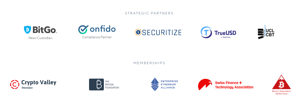 Nexo شرکای شناخته شده و معتبری نظیر بیت گو (BitGo) و TrueUSD را دارد. بیت گو (BitGo) شرکت امنیت بلاک چین و دارایی های کریپتویی است که خدماتی را برای کیف پول کریپتویی ارائه می دهد. این شرکت واقع در کالیفرنیا آمریکا است و از سال ۲۰۱۳ کار خود را آغاز کرده است. TrueUSD نیز استیبل کوینی است که با دلار آمریکا پشتیبانی می شود. این استیبل کوین توسط تراست توکن (TrustToken) ایجاد شده است و از اعتبار خوبی در این بازار برخوردار است. شرکای نکسو را در عکس زیر می توانید مشاهده کنید: